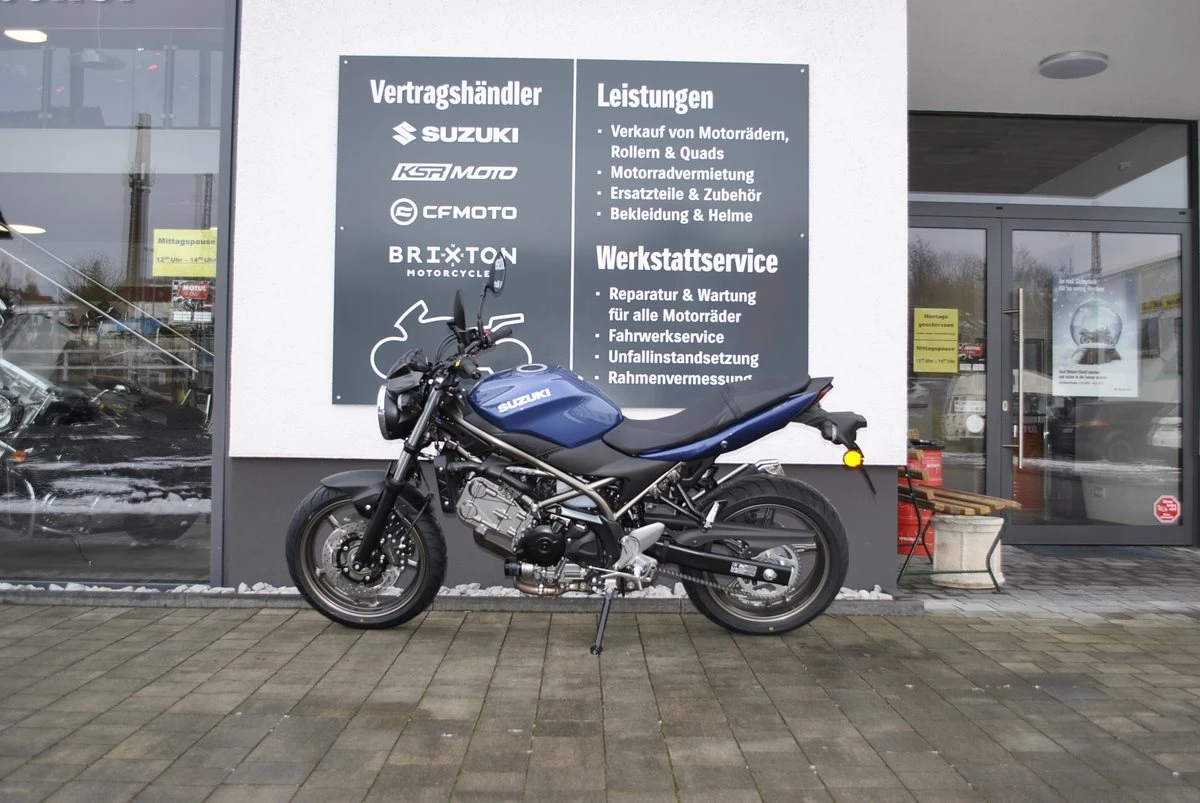SSuzuki SV 650 A Stadt, Land, Kurvenspaß - ganz gleich, wie lange Du schon Motorrad fährst: Den Charakter, Biss und fetten Sound der leichten V2-Allrounderin willst Du jeden Tag erleben. Leistung & Verbrauch: - Nennleistung 54 kW / 8500 min-1 (73 PS) - Maximales Drehmoment 64 Nm / 6800 min-1 - Tankinhalt 14,5 Liter - Höchstgeschwindigkeit über 180 km/h - CO2-Emission 96 g/km - Kraftstoffverbrauch 4,1 l/100km - Leistungsvarianten 48 PS / 73 PS Aktionen bis 31.03.2024: - Führerscheinrabatt 300 - Drosselung 48 PS möglich Die unverbindliche Preisempfehlung (UVP) des Herstellers beträgt 7450 , inklusive Nebenkosten. Der angegebene Preis entspricht unserem Barpreis. Bei Fragen zu aktuellen Finanzierungsmöglichkeiten und Aktionen, zögern Sie bitte nicht, uns per E-Mail zu kontaktieren Fahrzeugcenter Gaßmann Tel & WhatsApp: 03606 603609 eMail: info at fahrzeugcenter-gassmann.de Öffnungszeiten: Di - Fr 10:00 Uhr - 12:30 Uhr / 14:00 Uhr - 18:00 Uhr oder nach Vereinbarung Mit über 20 Jahren Erfahrung im Zweiradbereich stehen wir Ihnen gerne zur Seite, um Ihnen bei sämtlichen Anliegen zu helfen. Von der routinemäßigen Wartung über Reparaturen und Umbauten bis hin zum Batterieservice, Reifenservice und sogar der Hauptuntersuchung - bei uns sind Sie in besten Händen! Alle Angaben ohne Gewähr. Tippfehler und Irrtümer vorbehalten.