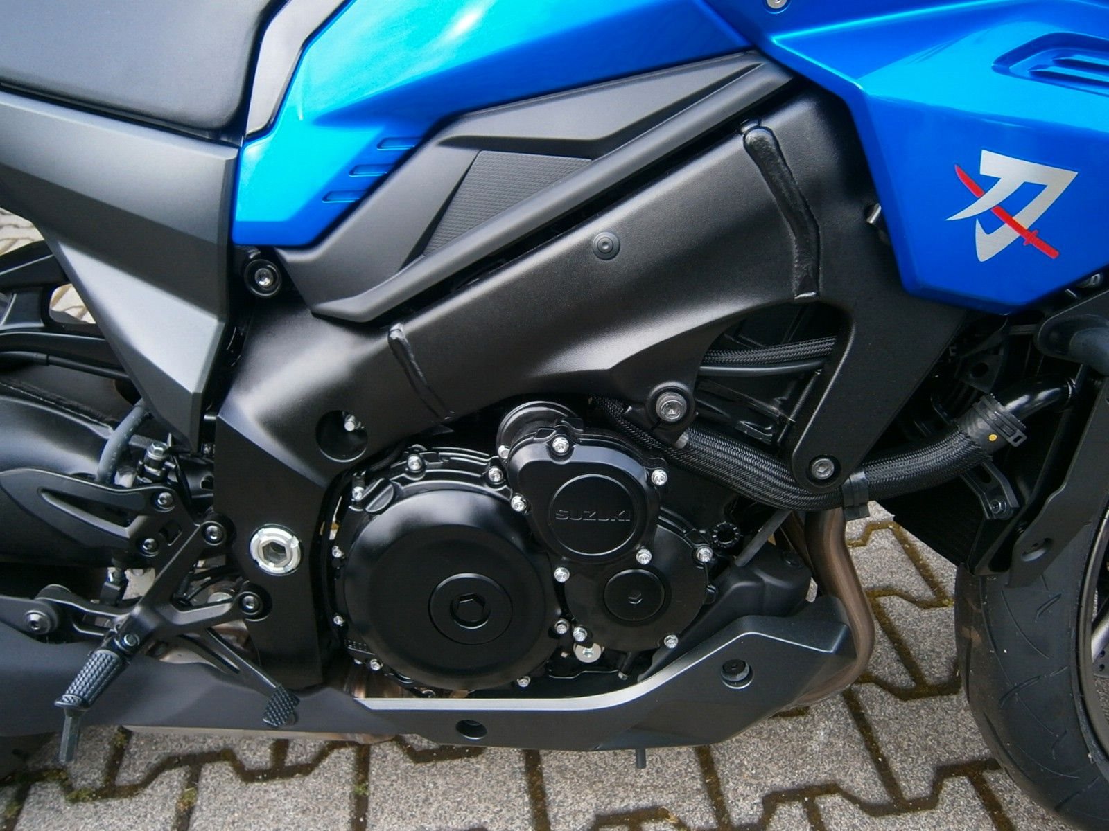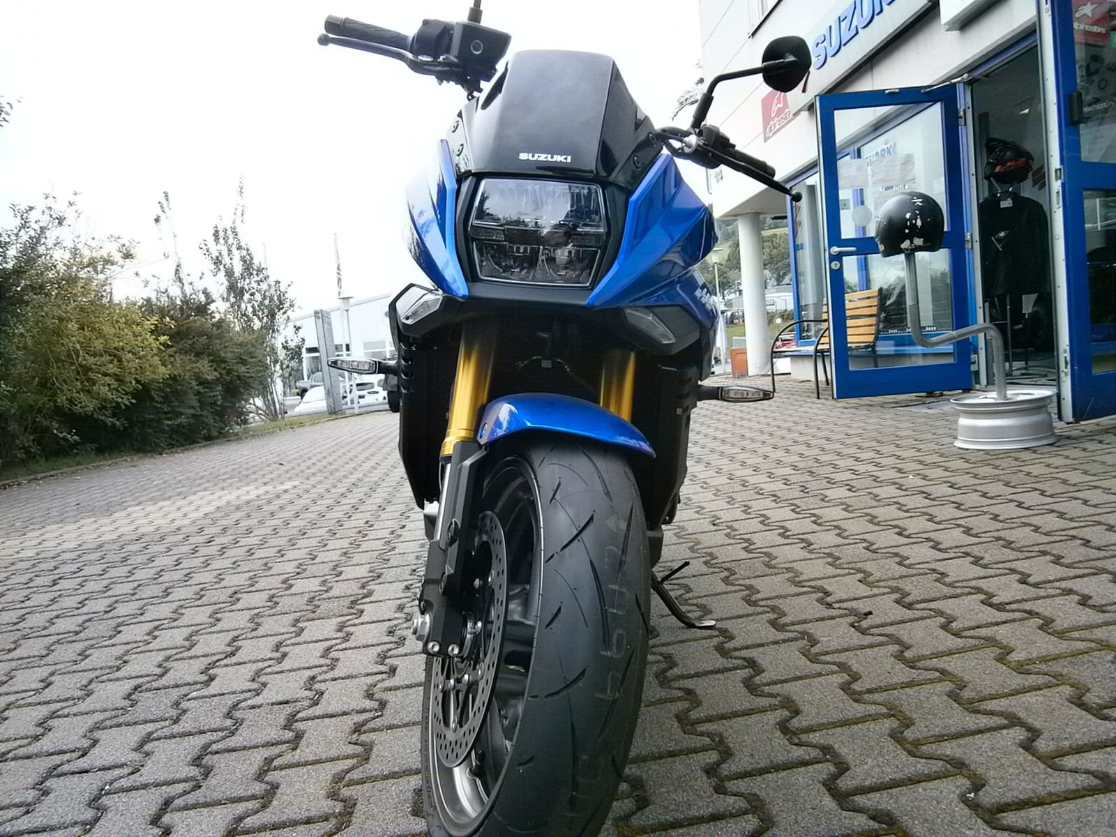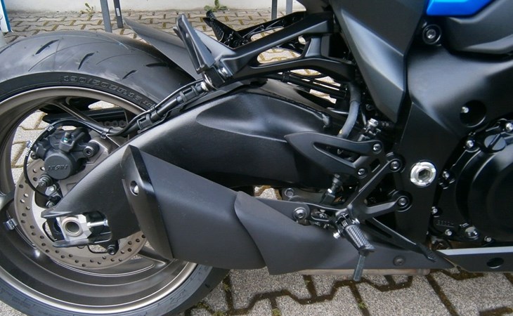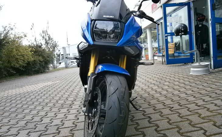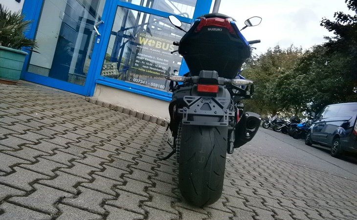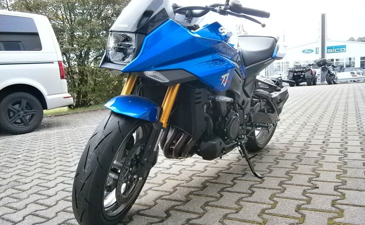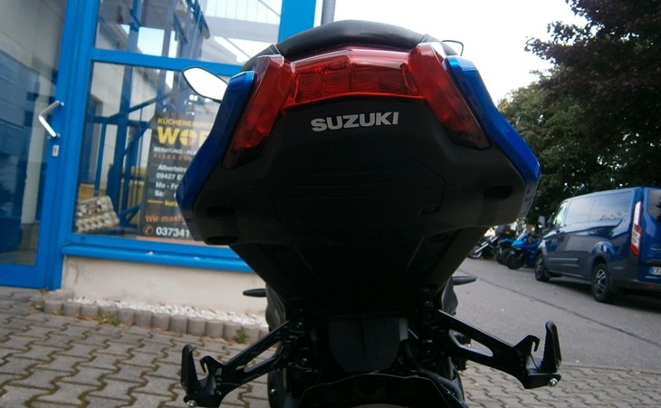 - Ride-By-Wire - Kraftstoffeinspritzung, Suzuki Drive Mode Select (SDMS), Easy-Start System, Low-RPM Assist System Motorschmierung Nass-Sumpf mit Wärmetauscher Auspuffanlage SET Suzuki Exhaust Tuning Anlassersystem Elektrostarter Kupplung, Betätigung Mehrscheiben-Nassbadkupplung mit Suzuki Clutch Assist System (Anti-Hopping- & Servokupplung), Getriebe / Schaltung 6-Gang / Fußschaltung, Quickshifter (Schaltassistent, Blipper) Endantrieb Dichtring-Kette Übersetzungen primär / sekundär 1,55 / 44/17 Übersetzung Endantrieb 2,59 Getriebe-Übersetzungen 2,56 / 2,05 / 1,71 / 1,50 / 1,36 / 1,27 Fahrwerk & Bremsen Rahmenbauart (Werkstoff) Brückenrahmen (Aluminium) Vorderradaufhängung USD-Teleskopgabel 43 mm Federung / Dämpfung vorne Schraubenfedern / Cartridge-System Einstellung vorne voll einstellbar Hinterradaufhängung Superbike-Schwinge (Aluminium) Federung / Dämpfung hinten Zentralfederbein, Hebelsystem / Gasdruckdämpfer Einstellung hinten Federvorspannung 7-fach, Zugstufe stufenlos Lenkwinkel 29 ° Wendekreis 6,8 m Federweg vorne / hinten 120 mm / 130 mm Bremsanlage vorne Ø Doppelscheibenbremse 310 mm Bremszange(n) vorne Brembo Vierkolben-Radialbremssattel Bremspumpe vorne Tokico-Radialpumpe Bremsanlage hinten Ø Einscheibenbremse 250 mm Bremszange hinten Einkolben-Faustsattel