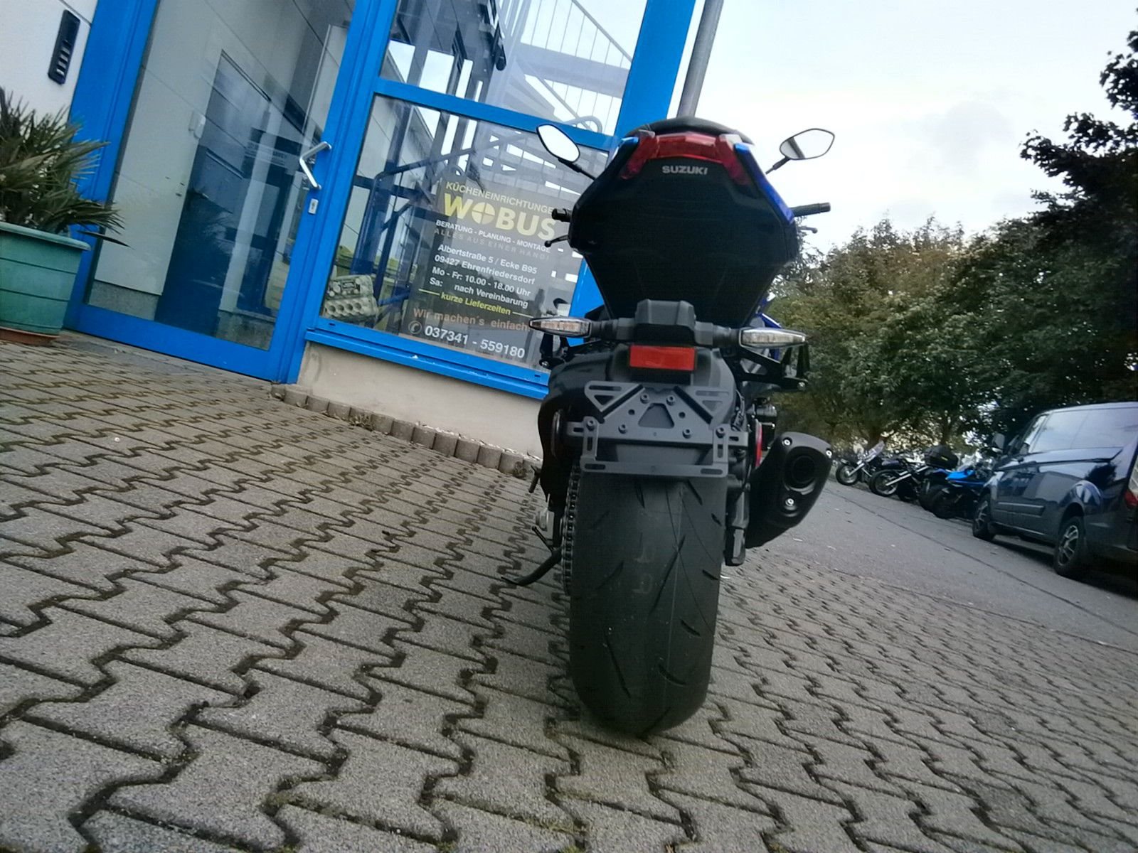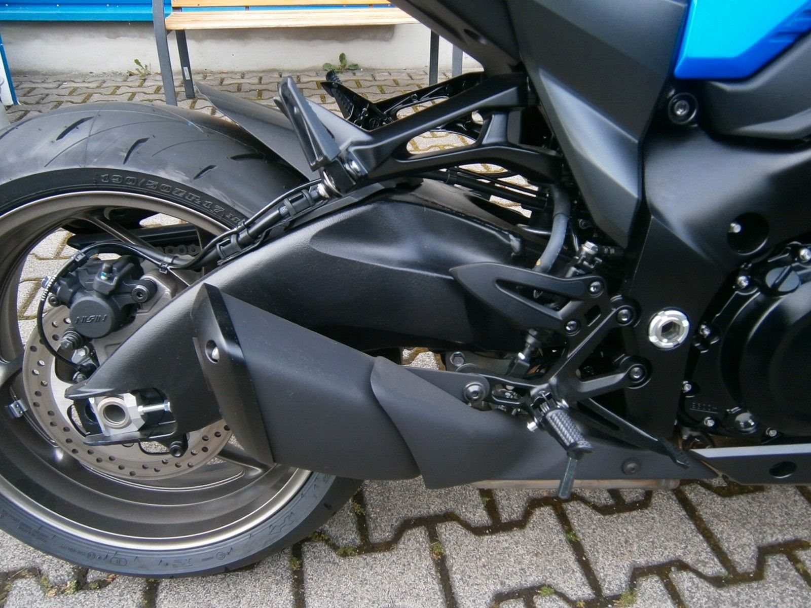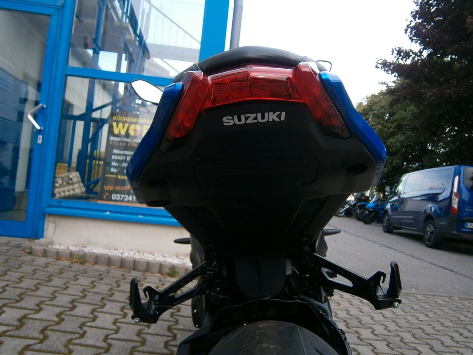 - Ride-By-Wire - Kraftstoffeinspritzung, Suzuki Drive Mode Select (SDMS), Easy-Start System, Low-RPM Assist System Motorschmierung Nass-Sumpf mit Wärmetauscher Auspuffanlage SET Suzuki Exhaust Tuning Anlassersystem Elektrostarter Kupplung, Betätigung Mehrscheiben-Nassbadkupplung mit Suzuki Clutch Assist System (Anti-Hopping- & Servokupplung), Getriebe / Schaltung 6-Gang / Fußschaltung, Quickshifter (Schaltassistent, Blipper) Endantrieb Dichtring-Kette Übersetzungen primär / sekundär 1,55 / 44/17 Übersetzung Endantrieb 2,59 Getriebe-Übersetzungen 2,56 / 2,05 / 1,71 / 1,50 / 1,36 / 1,27 Fahrwerk & Bremsen Rahmenbauart (Werkstoff) Brückenrahmen (Aluminium) Vorderradaufhängung USD-Teleskopgabel 43 mm Federung / Dämpfung vorne Schraubenfedern / Cartridge-System Einstellung vorne voll einstellbar Hinterradaufhängung Superbike-Schwinge (Aluminium) Federung / Dämpfung hinten Zentralfederbein, Hebelsystem / Gasdruckdämpfer Einstellung hinten Federvorspannung 7-fach, Zugstufe stufenlos Lenkwinkel 29 ° Wendekreis 6,8 m Federweg vorne / hinten 120 mm / 130 mm Bremsanlage vorne Ø Doppelscheibenbremse 310 mm Bremszange(n) vorne Brembo Vierkolben-Radialbremssattel Bremspumpe vorne Tokico-Radialpumpe Bremsanlage hinten Ø Einscheibenbremse 250 mm Bremszange hinten Einkolben-Faustsattel